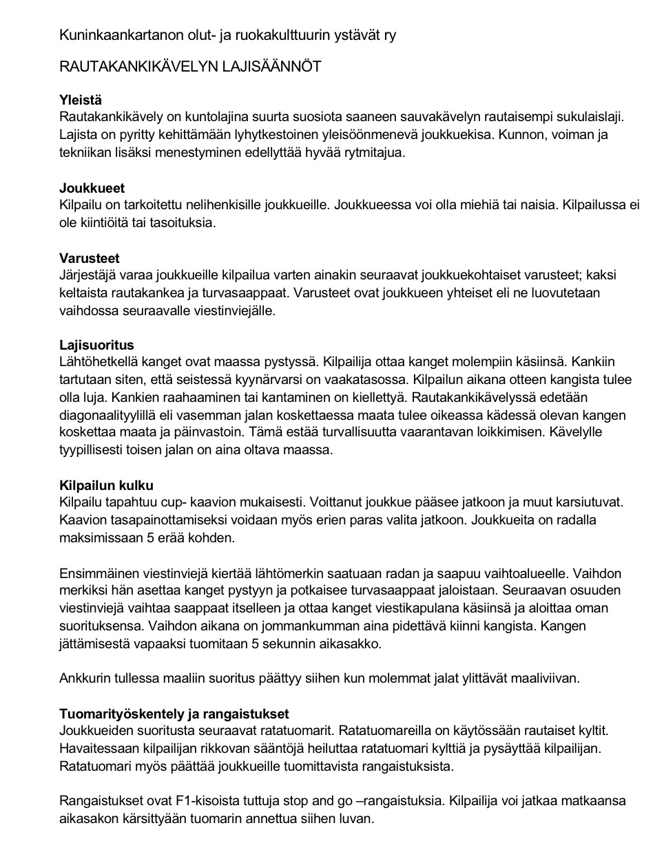 Rautakankikävely on sauvakävelyn rautaisempi muoto, jossa kävelysauvojen tilalla ovat 6,5 kg painavat rautakanget (kuva) ja jalassa 1,5 kg painavat turvasaappaat (kuva). Kuten nimikin kertoo, kyseessä on kävely, toisen jalan pitää olla aina maassa (kuva) ja polven ojentua ns. hiipiminen johtaa ragaistukseen. Turvallisuus syystä kävely etenee diagonaalityylillä, jolloin vastakkaisen puolen käsi ja jalka ovat samanaikaisesti edessä tai takana (kuva). KKY varaa joukkueille kanget ja saappaat. Varusteet ovat joukkueen yhteiset, ne siis vaidetaan seuraavalle viestinviejälle.